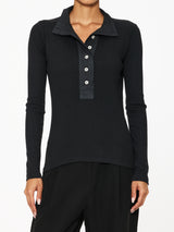 Meet the hybrid that redefines balance. The Junia Henley is cut in a mix of rib cotton and crisp poplin, soft stretch meets sharp structure. Its ribbed body skims close with ease, while the poplin collar and placket slice the silhouette with tailored contrast.