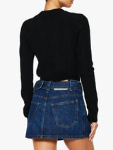 Intricate custom designed cable knit artwork graces this form-hugging Alpaca wool blend cardigan. Designed with a placket featuring a keyhole detail, asymmetrically placed for added interest. Crafted using fully-fashioned knitwear techniques for a seamless finish.