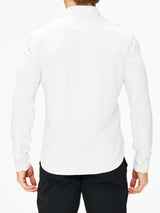 Spread collar. Button front. Two chest patch pockets with button-through. Shirttail hem.