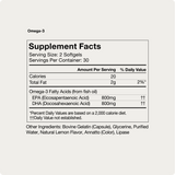 Omega-3 Fatty Acids (from fish oil) EPA 800mg, DHA 800mg, Bovine Gelatin (Capsule), Glycerine, Purified Water, Natural lemon Flavor, Annatto (color), Lipase