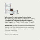The Momentous Three combines Protein, Creatine, and Omega-3—three essential nutrients shown to support long-term health, performance, and cognitive function. This trio forms the foundation of daily supplementation for athletes, high performers, and anyone looking to improve energy, recovery, and mental clarity, giving performance for life™.