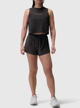 Lightweight mid-crop training tank constructed from AeroSilver®, the brand's silver-infused performance fabric engineered for durability, odor control, and breathability. Designed with a curved hem and side splits reinforced with tack seams for added mobility. Finished with reflective logo details for visibility during low-light workouts.