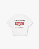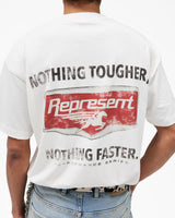 Introducing the Nothing Faster T-Shirt in Flat White, a standard oversized silhouette with a slightly shorter length, made from a lightweight cotton and hemp blend with a stained vintage finish. Designed to age over time, the fabric develops character through wear and washing.
