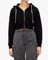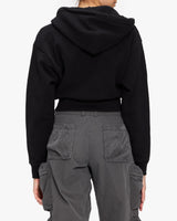 Cropped zip up hoodie in fleece french terry. Drop shoulder and exaggerated sleeves. Rib cuff and hem. Drawcord at hood. Riri zippers. Made in Los Angeles.