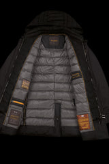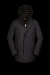Length 78,5 cm. Straight goose feather padded coat. Quilted feather padded detachable vest insert made of down-proof fabric fastened by a metal zip. Double front fastening consisting of brushed metal double glider zip and buttoning with horn buttons. Welt pockets on the sides. Back vent closed with concealed snap buttons. Interior boudin-quilted throughout with handy pockets for valuables. Fabric composition: Lightweight waterproof fabric 100% polyester.