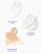 This handy kit is the easiest way to try the sunscreen you've seen all over your feed or stock up on your faves before your next trip. Glowscreen SPF 40 is a glowy tinted sunscreen with a luminous, sunkissed finish that primes for makeup, visibly evens tone and is clinically tested to deliver all-day hydration*. Unseen Sunscreen SPF 50 is the iconic 100% invisible, weightless, scentless sunscreen that’s non-irritating, doubles as a primer for all-day makeup wear² and is clinically tested to improve skin clarity¹. PLAY Everyday Lotion SPF 50 is a fast-absorbing, non-greasy sunscreen face and body lotion that hydrates skin and is water- and sweat-resistant for 80 minutes.